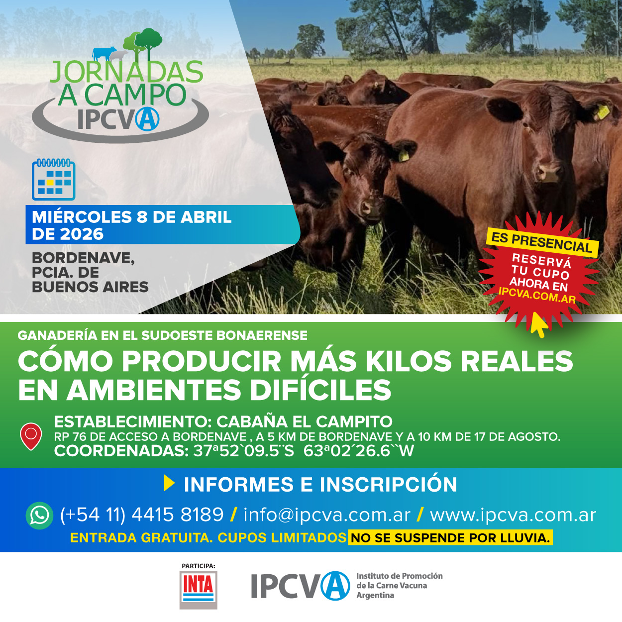 Será con entrada libre y gratuita, pero cupos limitados.  Este 8 de abril llega una nueva Jornada a Campo del Instituto de Promoción de la Carne Vacuna Argentina (IPCVA). Se realizará en el Establecimiento Cabaña El Campito (RP 76 de acceso a Bordenave, a 5 km de Bordenave, y a 10 Km de 17 de agosto). El encuentro incluirá disertaciones técnicas y dos “paradas” o salidas a campo: “Sainfoin: La leguminosa todoterreno que no empasta y produce donde la alfalfa falla” y “Ciclo completo de alta eficiencia: cómo producir el novillo pesado que el mercado paga mejor”. Algunas de las disertaciones previstas son las siguientes: “Más terneros y menos trabajo, cómo elegir una genética que se adapte a nuestro campo” (Juan Martín Narbaitz, Centro Argentino de Biotecnología Animal), “Perspectivas de mercados, cómo la dopamina ganadera y la adrenalina de la industria frigorífica marcan el ritmo del negocio” (Adrian Bifaretti, IPCVA), “Blindar el negocio, cómo cumplir con la Unión Europea y asegurar el acceso a mercados de exportación” (Gerardo Leotta, Consorcio ABC), “Claves de siembra para suelos con limitantes, el método MAG en implantación de pasturas” (Guillermo Marrón, INTA Castelar), “Chip electrónico obligatorio 2026: guía para la trazabilidad que se viene” (Silvio Marchetti, Secretaría de Agricultura, Ganadería y Pesca de la Nación) y “El poder de los cruzamientos: cómo ganar un 20% extra de kilos usando vigor híbrido”, Rodolfo Peralta (asesor privado). La apertura de la jornada estará a cargo de Héctor Montero (propietario), Federico Castoldi (INTA) y Georges Breitschmitt (presidente del IPCVA). Como todos los eventos que organiza el IPCVA, la entrada será libre y gratuita pero con cupos limitados por lo que se solicita realizar una preincripción INGRESANDO ACÁ: https://docs.google.com/forms/d/e/1FAIpQLSeah5lxGCK2UrTbZ6Iltu4aQxurd9mYOOoqtRge5yQXsoMNPQ/viewform o llamando al (+54 11) 4415 8189 Organiza: IPCVA Participa: INTA No se suspende por lluvia.