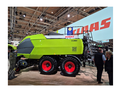 La segunda medalla de oro reconoció a la nueva Mega Empacadora de CLAAS (Figura 14), un rediseño integral que incorpora volantes de inercia superiores a 200 kg, chasis reforzado, sistemas de atado de doble nudo de alta resistencia y un algoritmo predictivo que ajusta la densidad del fardo antes de que ocurran variaciones bruscas en el flujo de material. Este enfoque anticipativo produce fardos más uniformes, reduce fallas de atado y aumenta la productividad. Para el productor, estas mejoras se traducen en una logística más eficiente, menor pérdida de biomasa y un forraje o fibra más homogéneo en calidad y conservación.