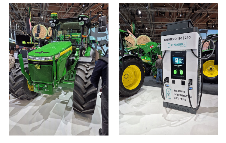 Figura 1: Tractor John Deere E-Power (130 CV de potencia continua), desarrollado sobre una nueva plataforma de propulsión eléctrica y conducción autónoma. El sistema ofrece cero emisiones y la posibilidad de integrar hasta cinco baterías para ajustar la autonomía, con conectividad plena al Operations Center de John Deere. Incorpora motores eléctricos independientes para tracción, TDF y sistemas hidráulicos, además de unidades auxiliares para componentes periféricos. La estación de carga Chimero 180/240 permite carga rápida en corriente continua, con potencias de hasta 240 kW, capacidad de carga simultánea, gestión inteligente y compatibilidad con estándares CCS y CHAdeMO, incluyendo comunicación Ethernet/4G/Wi-Fi y protocolos OCPP.
