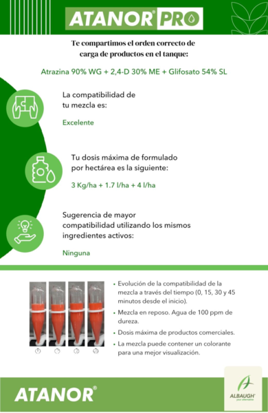 Estas combinaciones de activos generaron 230 combinaciones de productos comerciales de la marca Atanor, que fueron analizadas una a una en laboratorio para caracterizar su grado de compatibilidad. Estos resultados se usaron para construir una base de datos que alimenta la herramienta digital “Compatibilidad de mezclas ATANOR”. En ella, el usuario selecciona los componentes deseados en un proceso de diferentes etapas y obtiene información del orden correcto de carga de los productos en el tanque junto al resultado del análisis de compatibilidad de estos productos comerciales de ATANOR.