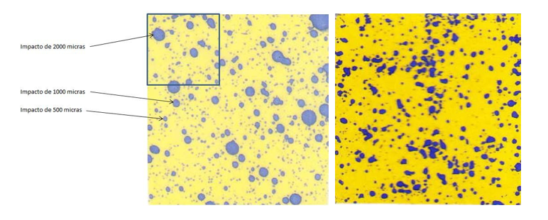 Figura 4. Tarjetas hidrosensibles obtenidas con 90 y 150 lts/ha, respectivamente, con una aplicación hecha a 15 km/h.