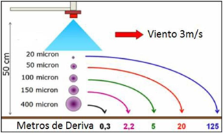 Figura 3. Metros de deriva, según tamaño de gota (Geosistemas SRL, 2017) (adaptado de GRDC – Australia).