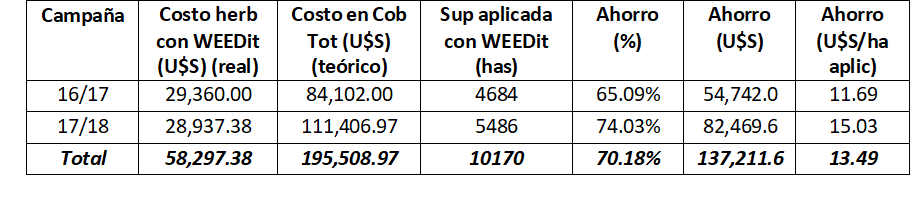 Por eficiencia, entendemos como la “capacidad de lograr ese efecto en cuestión con el mínimo de recursos posibles o en el menor tiempo posible”. En esta propiedad, los números hablan por sí solos: como resumen de dos campañas agrícolas, hemos logrado reducir el costo de herbicidas en 13.5 U$S/ha, con un porcentaje de ahorro promedio del 70% en la superficie realizada con Pulverización Dirigida (tabla 3), comparando lo gastado efectivamente con Pulverización Dirigida (segunda columna) vs lo que hubiéramos gastado en pulverización convencional o en cobertura total, con los mismos tratamientos (tercera columna). Cabe aclarar que en el escenario actual de la problemática de malezas, hay una parte importante de los costos que obedece al uso de residuales o premergentes que, entendemos, no serían sustituibles por esta tecnología.