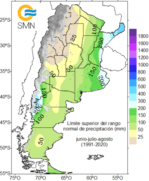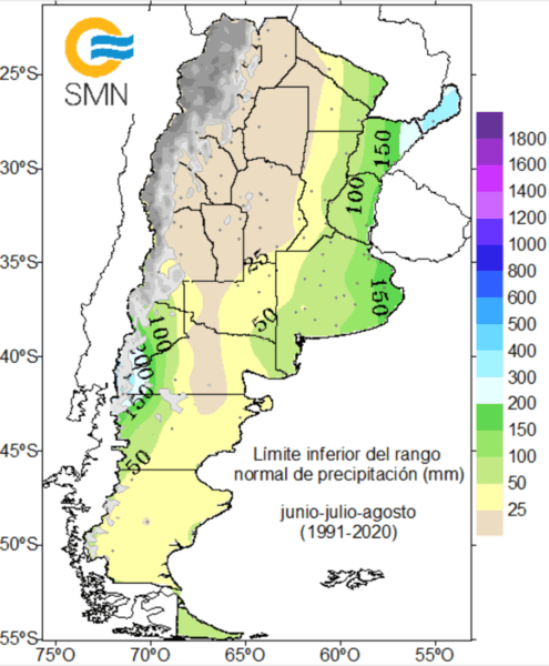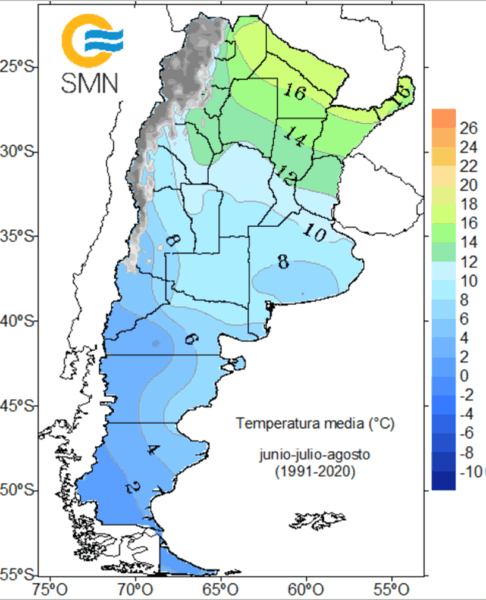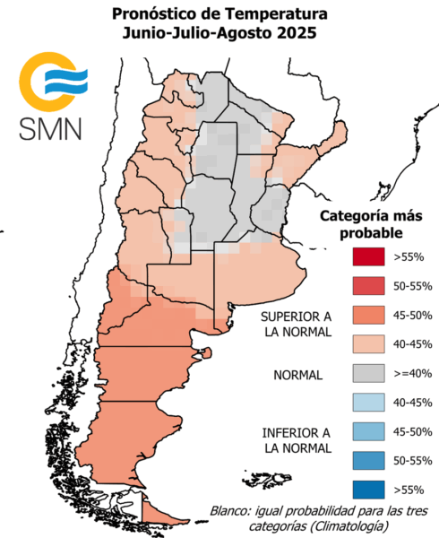 En este contexto, el pronóstico climático del SMN para el trimestre de invierno meteorológico (junio-julio-agosto; JJA) confirma que las condiciones no cambiarán radicalmente en el corto plazo. Se espera una mayor probabilidad de temperaturas medias por encima de lo normal en gran parte del país (Figura 4), lo que implica que la temperatura media del trimestre mencionado sería al menos 0,5 °C mayor a los valores de temperatura media que observamos en la Figura 5 y por ende un potencial incremento de la evapotranspiración incluso en pleno invierno.