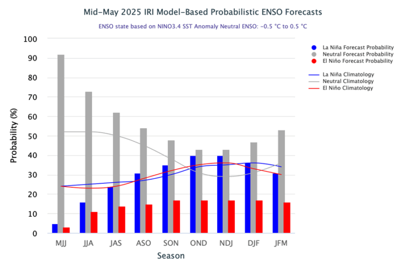 A esto se suma la señal clara que ofrece el monitoreo del ENSO: si bien junio aún transcurre bajo fase neutral, los modelos ya muestran una probabilidad creciente de transición hacia La Niña durante la primavera (Figura 9). Esto reconfigura los posibles escenarios para el segundo semestre del año, y aunque no afecta de forma directa la actual campaña de fina, es una alerta temprana que los sistemas productivos no pueden desestimar.