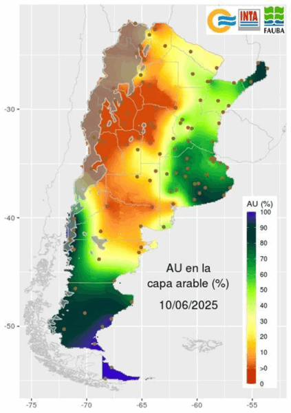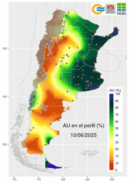 Esta situación, queda reflejada por las estimaciones de agua edáfica del Servicio Meteorológico Nacional (SMN) al 10 de junio: en la capa arable (Figura 2), la humedad es escasa a regular en buena parte del centro y norte argentino, con algunas excepciones en sectores del NEA y el sudeste de Buenos Aires. En cambio, en profundidad (Figura 3), el agua útil aún es suficiente en extensas áreas del centro-este, lo que da cierta tranquilidad para los estadíos iniciales de los cultivos de invierno.