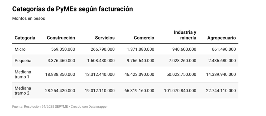 El problema no es el régimen en sí, sino la “regla” con la que se mide el tamaño de una empresa: la Ley PyME. Según los topes de facturación vigentes, actualizados por resolución de la Secretaría PyME el año pasado, una empresa minera o industrial se considera “Pequeña” si factura hasta 7 mil millones de pesos. En cambio, una empresa agropecuaria deja de serlo si supera los 2,4 mil millones de pesos. La diferencia de topes es de más del triple.