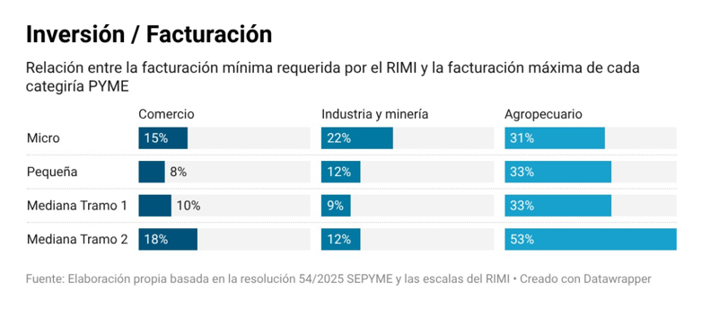 El RIMI, aprobado dentro de la Ley de Reforma Laboral, se basa en un laberinto de umbrales y escalas. Para acceder a los principales incentivos del régimen, una empresa debe invertir un monto mínimo que depende de cómo ha sido clasificada según el volumen de su facturación y el sector en el que se encuentra. Estas escalas fijan topes de facturación considerablemente más bajos para el sector agropecuario que para los demás, lo que significa que muchos productores no podrán adherirse al RIMI.